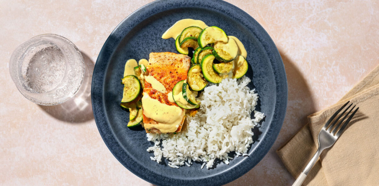 Esta fuente presenta una receta detallada de HelloFresh para preparar salmón noruego acompañado de una salsa cítrica de mostaza, calabacín y arroz. El texto especifica …