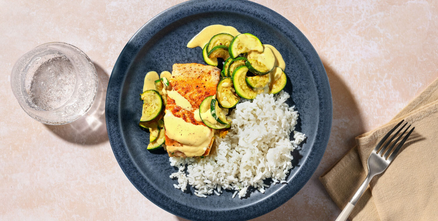 Esta fuente presenta una receta detallada de HelloFresh para preparar salmón noruego acompañado de una salsa cítrica de mostaza, calabacín y arroz. El texto especifica los ingredientes exactos y los valores nutricionales, destacando que es un plato de dificultad fácil con un aporte proteico significativo. Además de las instrucciones paso a paso para cocinar, se enumeran los utensilios necesarios para facilitar la elaboración en casa. El artículo también funciona como un catálogo, sugiriendo una amplia variedad de menús personalizados y otras alternativas culinarias disponibles en su plataforma. Finalmente, se incluye información corporativa sobre el servicio de suscripción y entrega de kits de comida.